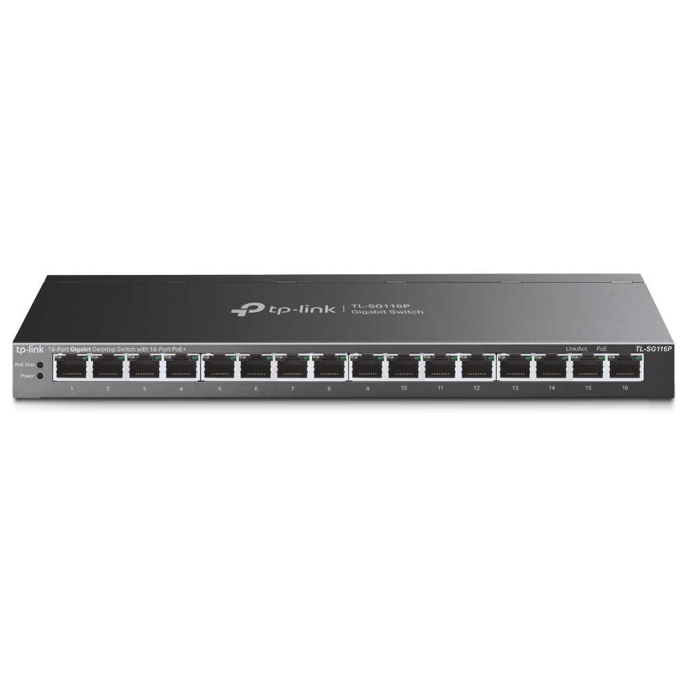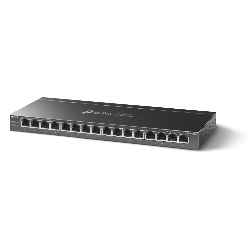 "16-Port Gigabit Desktop Switch with 16-Port PoE+ PORT: 16× Gigabit PoE+ Ports SPEC: 802.3at/af, 120 W PoE Power, Desktop Steel Case FEATURE: Extend Mode for 250m PoE Transmitting, Priority Mode for Port1-4, Isolation Mode, PoE Auto Recovery, Plug and Play"