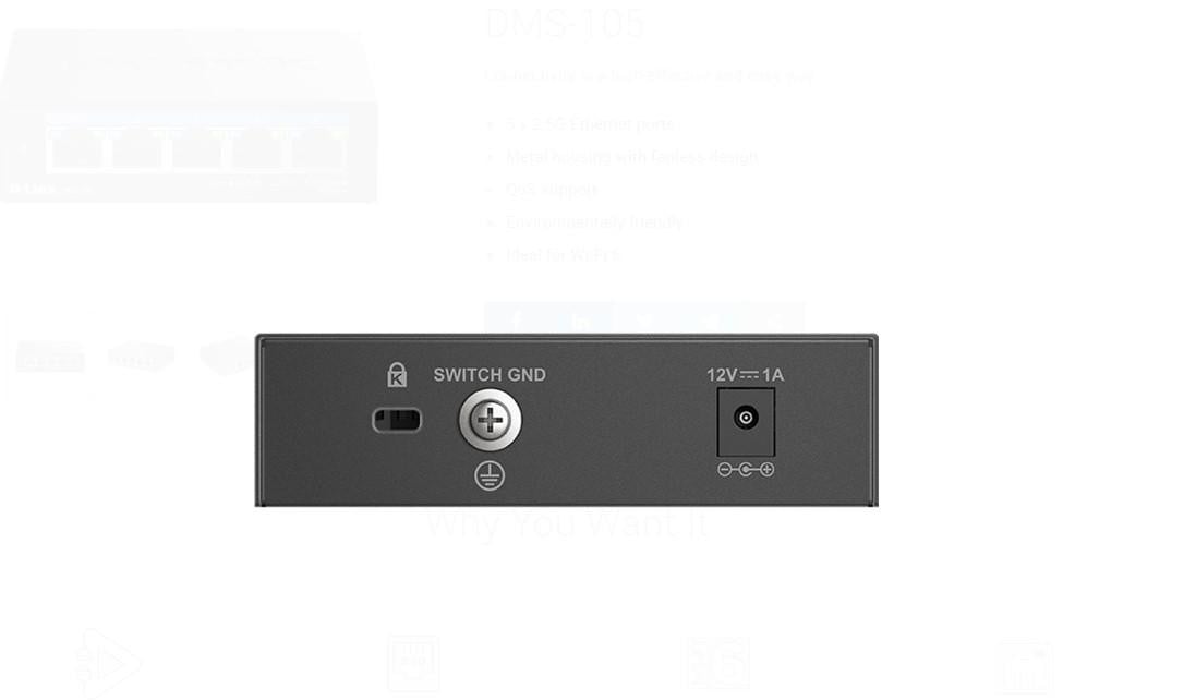 D-LINK DMS-105 UNMANAGED SWITCH 5 PORT, Interfata: 5 x 10/100Mbps/1G/2.5G, Auto MDI/MDIX, CAPACITATE SWITCH: 25gBPS, Packet Forwarding Rate:18.6 Mpps, Dimensiuni 100.5 x 82 x28mm, Greutate: 238.6 g.