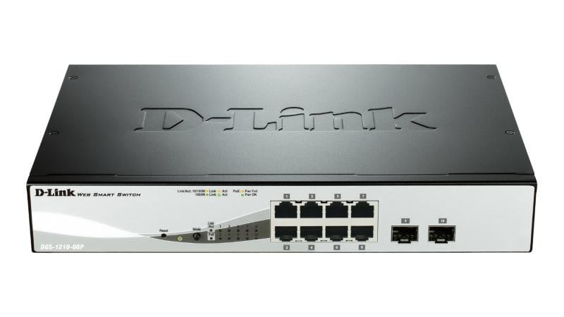 D-Link Switch DGS-1210-08P, 8 porturi Gigabit PoE 802.3af, PoE budget45W, 2 porturi combo 1000BaseT/SFP, Capacity 20Gbps, 16K MAC, W ebSmart,fanless