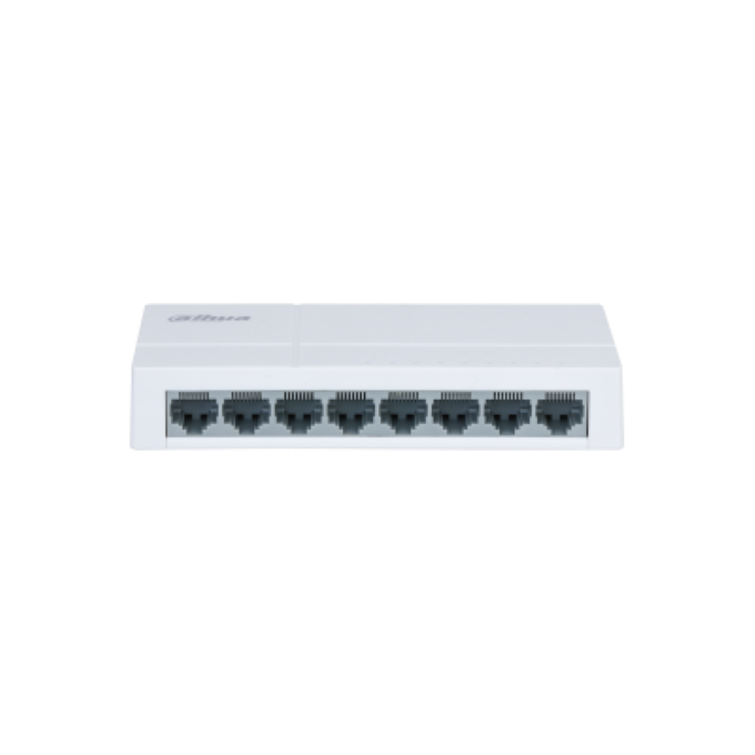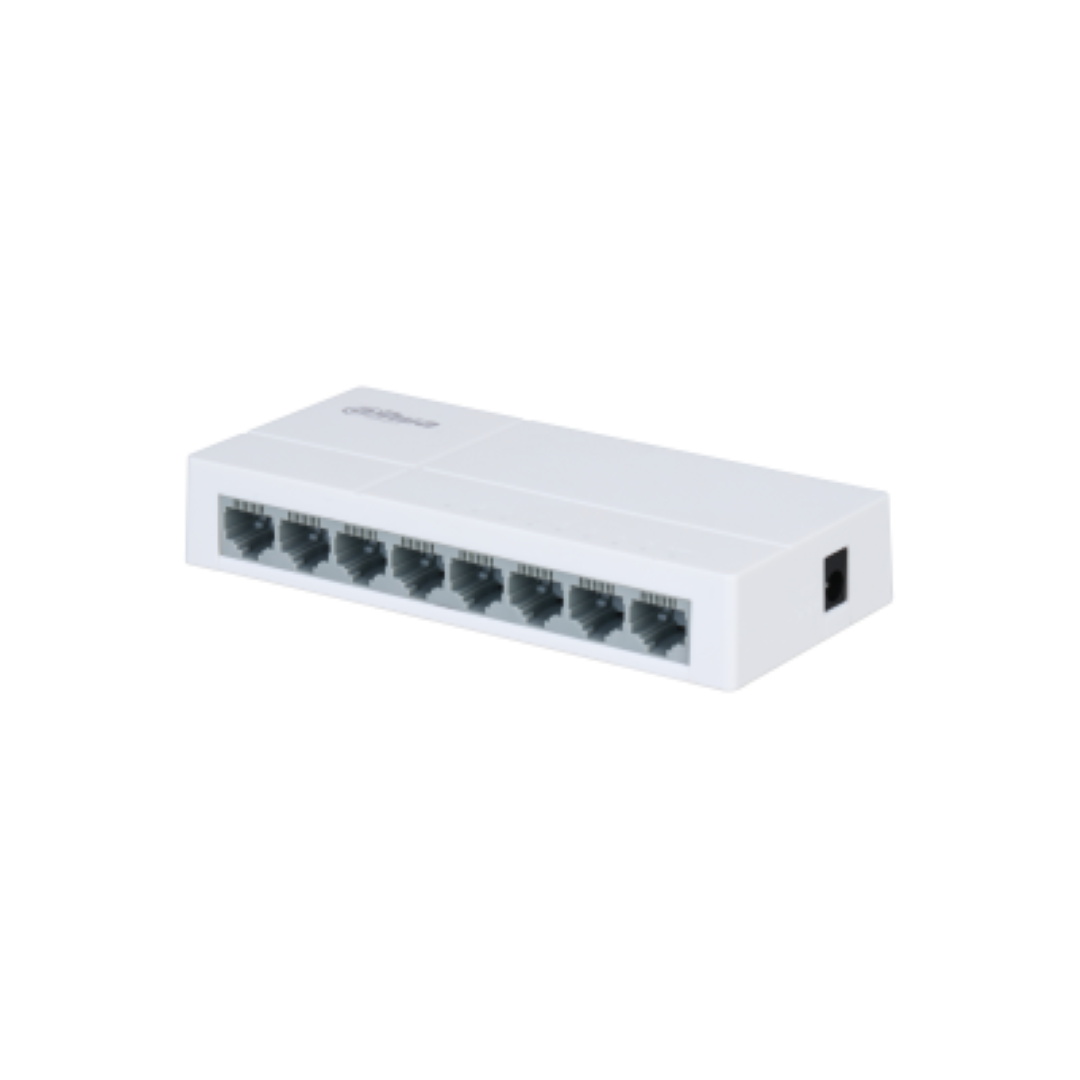 Switch Dahua 8 porturi Unmanaged, PFS3008-8ET-L, Interfata: 8 x 10/100 Mbps, Capacitate: 1.6 Gbit, Packet Forwarding Rate: 1.1904 MPPS, Greutate: 160g, Dimensiuni: 132.9 mm × 62.4 mm × 24.0 mm, Material carcasa: plastic.