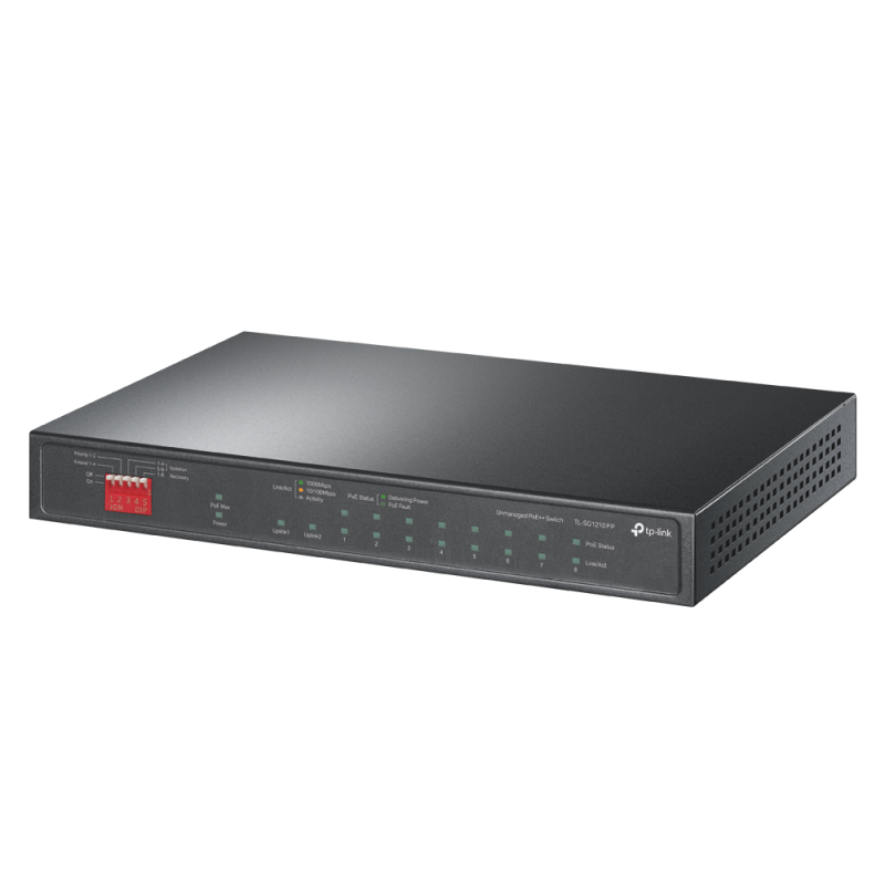 Switch Desktop 10-Port Gigabit with 6-Port PoE+ and 2-Port PoE++ PORT: 2× Gigabit PoE++ Ports, 6× Gigabit PoE+ Ports, 2x Gigabit Non-PoE Ports, 1× Combo Gigabit SFP Slot SPEC: 802.3af/at/bt type3, 123 W PoE Power, Desktop Steel Case FEATURE: Extend Mode for 250m PoE Transmitting for Port1-4, Priority Mode for Port1-2, Isolation Mode for Port1-4/5-8, PoE Auto Recovery for Port1-8, Plug and Play
