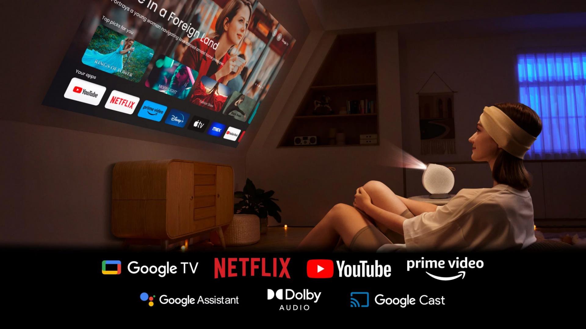 Videoproiector BenQ GV50, FHD 1920* 1080, up to 4K UHD (3840 x 2160), laser 20.000-30.000 ore, 500 ANSI lumeni, 16:9, 100.000:1, HDR, HLG, HDMI, USB Type A-1 (2.0/Power Supply1.0A/Reader/FW Upgrade), USB tip C, boxe 2* 4W, Woofer Cameră 10W, audio out, telecomanda cu baterie inclusa, cablu alimentare 1.8m, Smart Home, Google TV (Android 11), Bluetooth 5.0, 802,11 a/b/g/n/ac (2,4G/5G), AirPlay, Google Cast, 2.1 kg, Design flexibil similar cu un trepied incorporat adaptat pentru proiectia pe tavan de langa pat, culoare alb